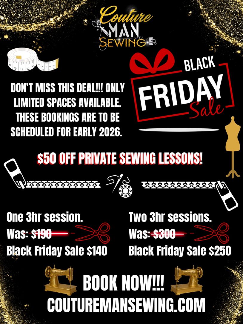 Couture Man Sewing is offering an incredible Black Friday deal on private sewing lessons! Don't miss out – limited spaces are available, with bookings for early 2026.